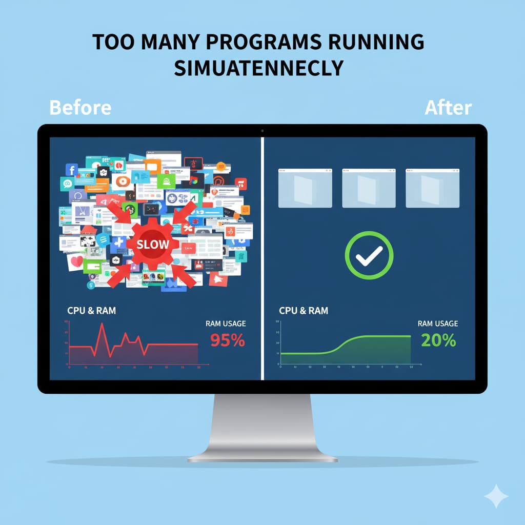 Explanation: The “Before” screen shows a cluttered desktop with many applications consuming high CPU and RAM. The “After” screen illustrates the improvement in performance and reduced resource usage after closing unnecessary programs.