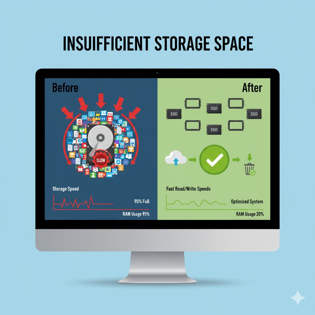 Explanation: The “Before” screen depicts a hard drive that’s almost full, leading to slow performance. The “After” screen illustrates a system with ample free space, faster read/write speeds with SSDs, and files moved to the cloud, resulting in better overall performance.
